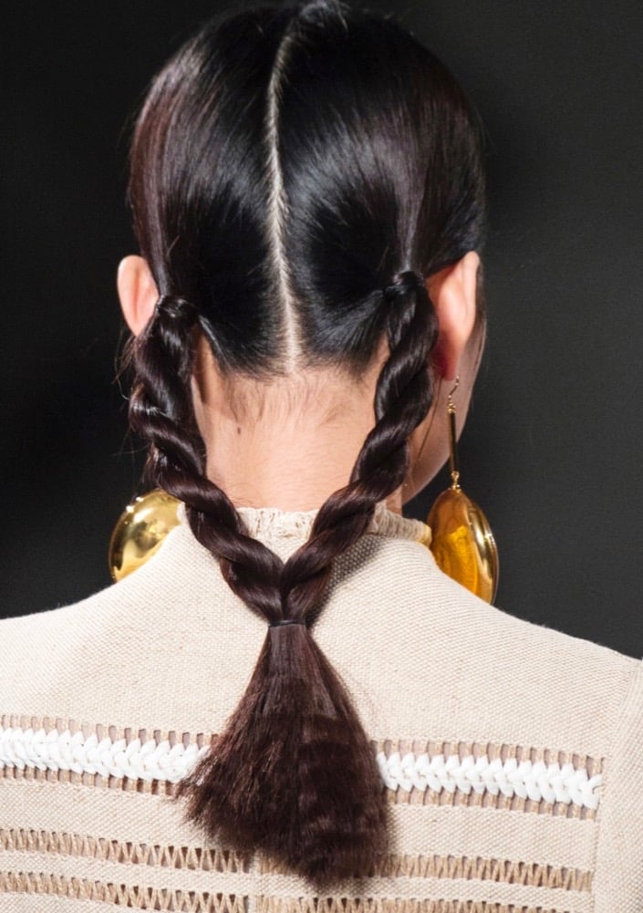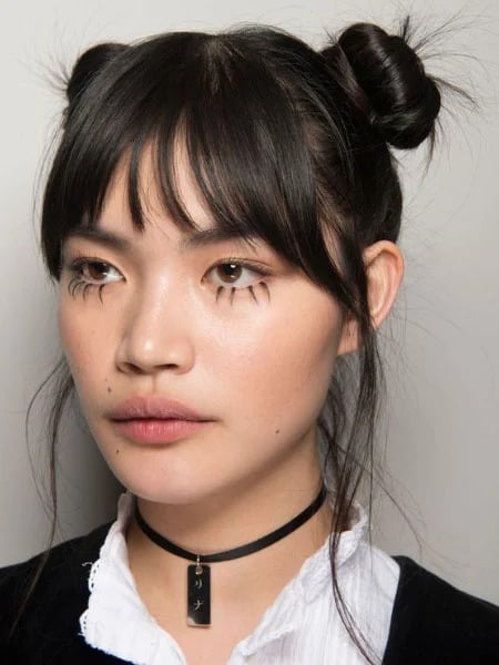 Baby space buns held together with a pair of black ribbons. Milly Bobby Brown plays the Red Carpet hair game well