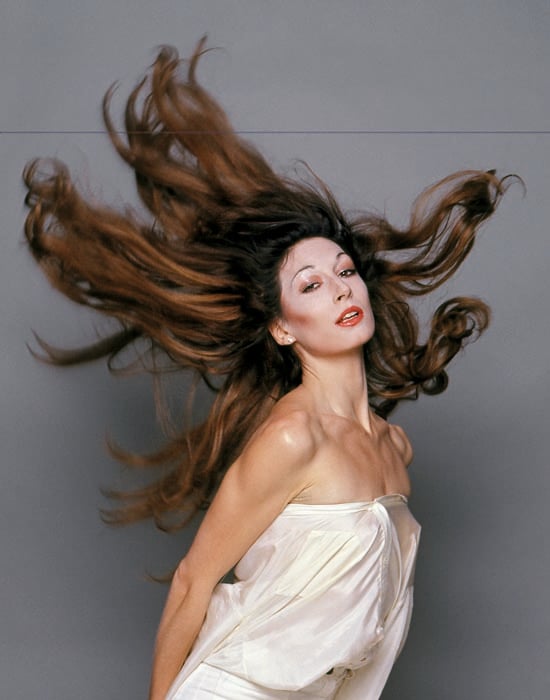 Lady-like glamour, voluminous curls with bangs in 1972, photo by Irving Penn for Vogue.