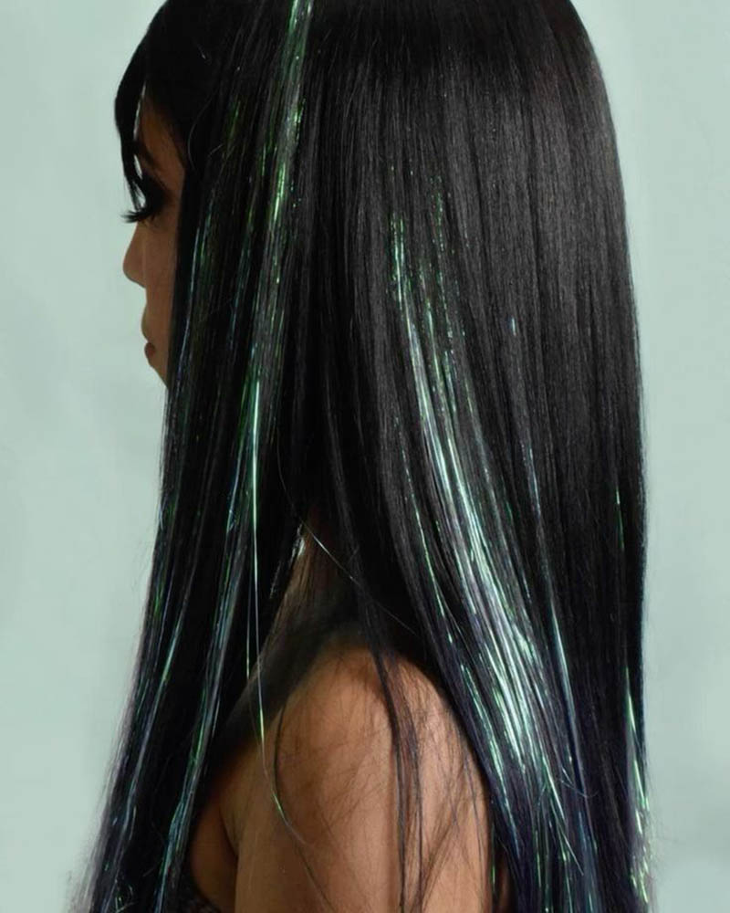 Life moves fast, so you need a hairstyle that'll keep up. A solo shade is just too vanilla for you – tinsel extensions are your twinkling solution.