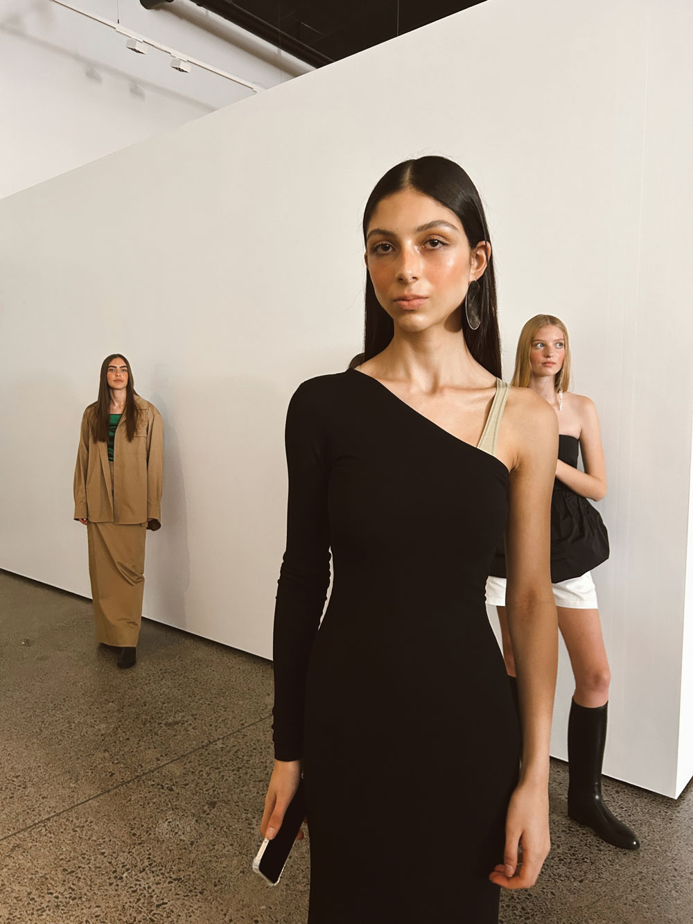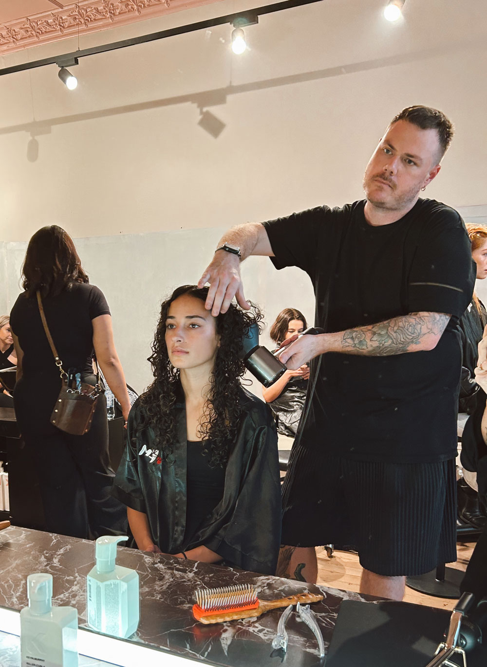 The brief was glossy and sleek glass hair alongside defined curls with a dewy, hydrated finish. The colleen team was led by Lauren Gunn using Kevin Murphy and Dyson to create two chic and fresh looks that complement Benjamin Alexander's cool, modern aesthetic being brought to life on the runway.