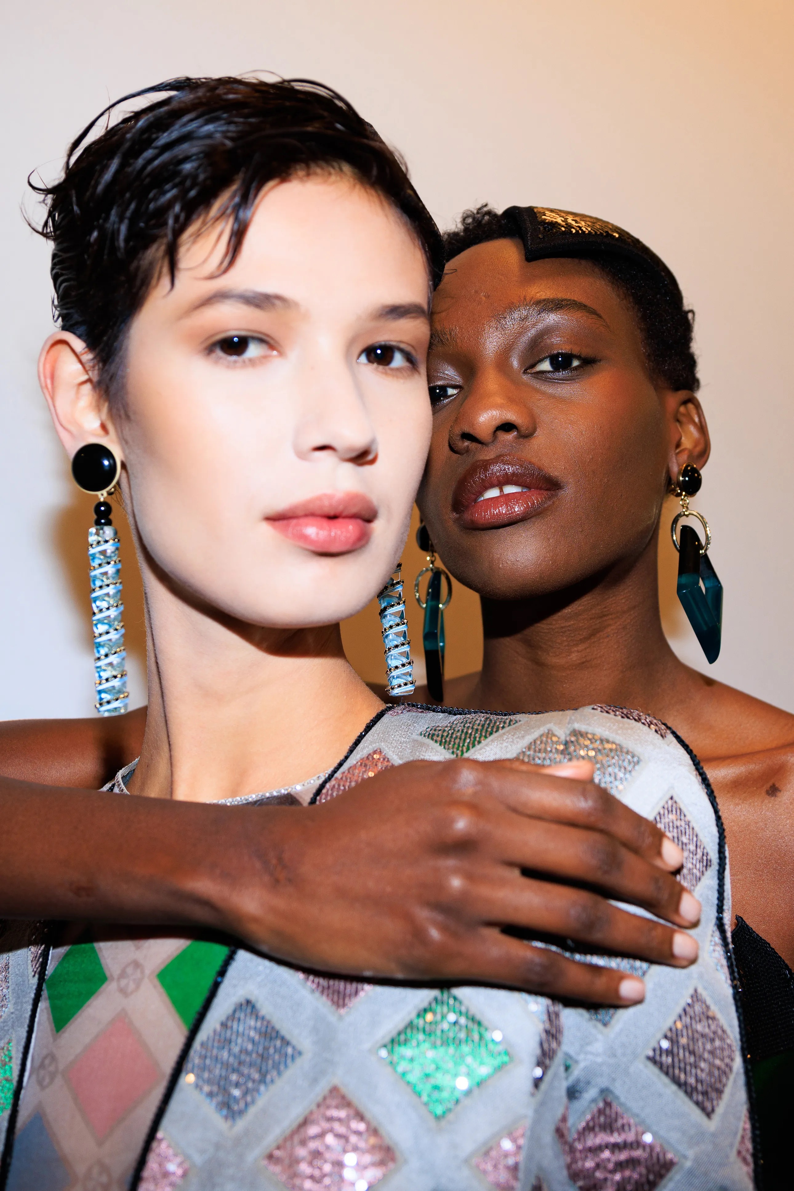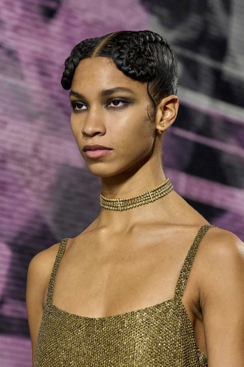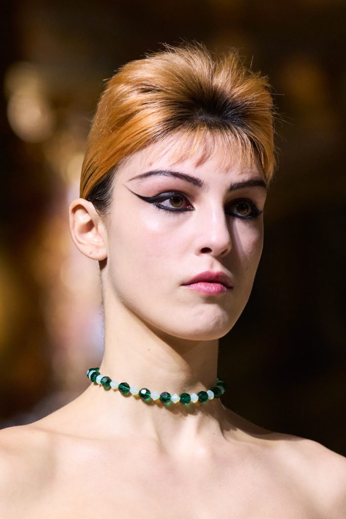 At Christian Dior, we saw a contemporary twist on the Kiss Curl; with short styles, braids and updos channelling the glitz and glamour reminiscent of dancer and activist, Josephine Baker, during the 1920s. The highlight was the braids pulled back in low buns, designed by hairstylist Guido, complemented by a silvery, smokey eye. Perfect for a sensous, low-light night.