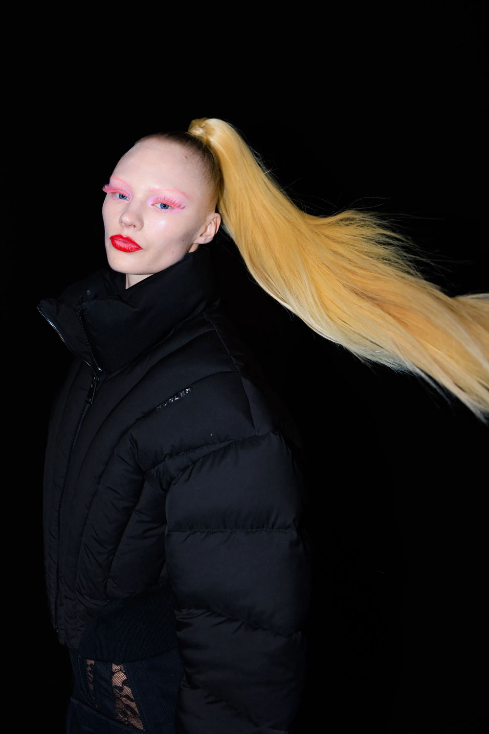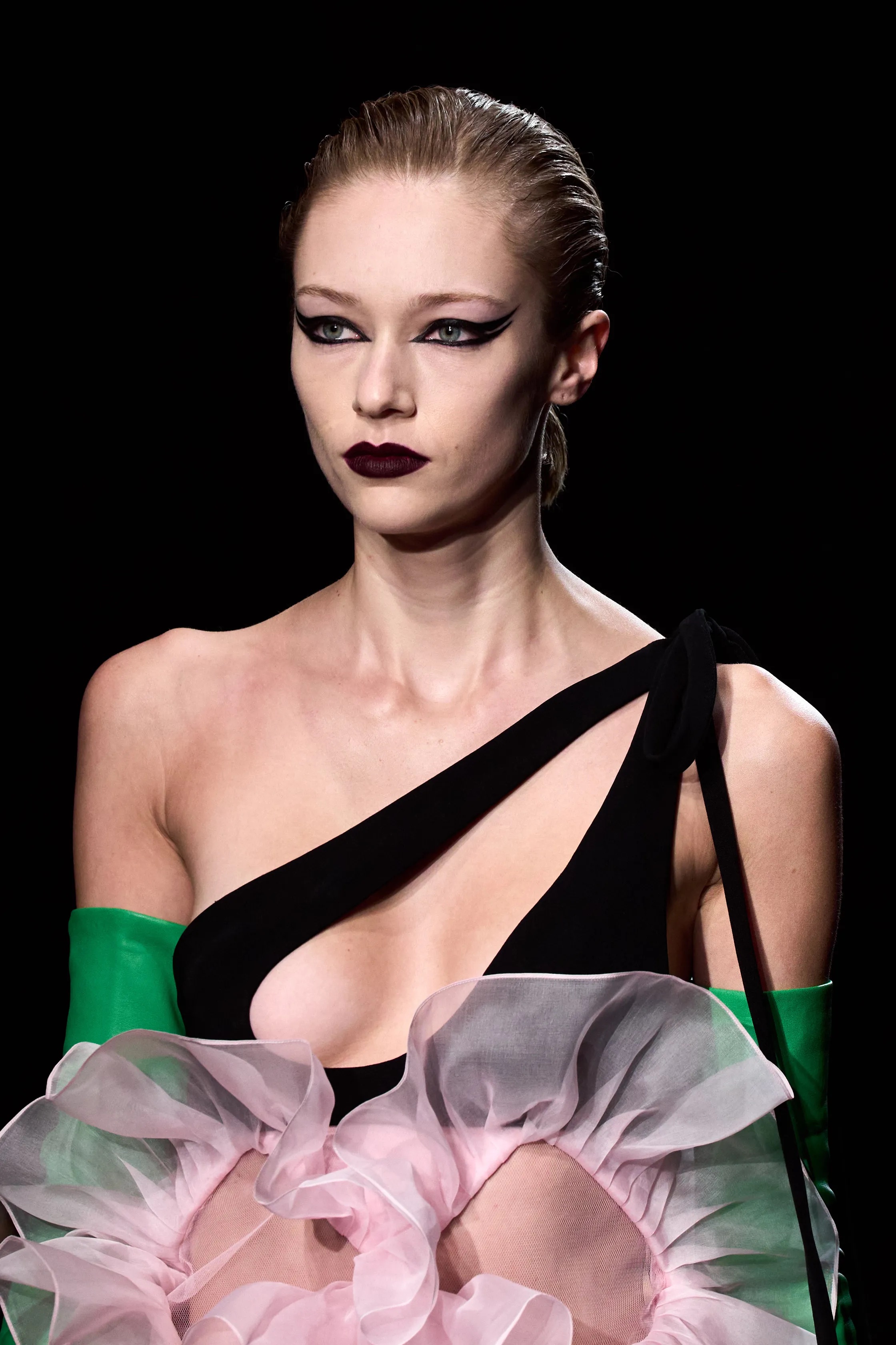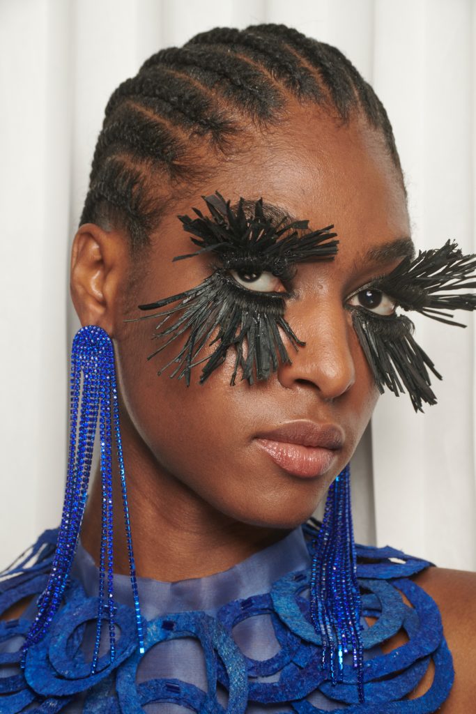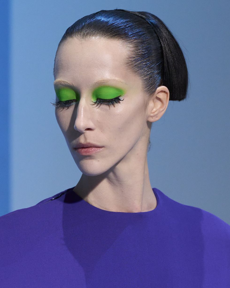 The elegance, the drama! Heider Ackermann for Jean Paul Gaultier looks are for the maximalist with refined sensibilities; it's creative, joyful and fun. From splashes of acid green, denim blue, and bubblegum pink – accented by exaggerated, clumped doll lashes. Bold neon makeup is serving a look with purpose and we want to see more.