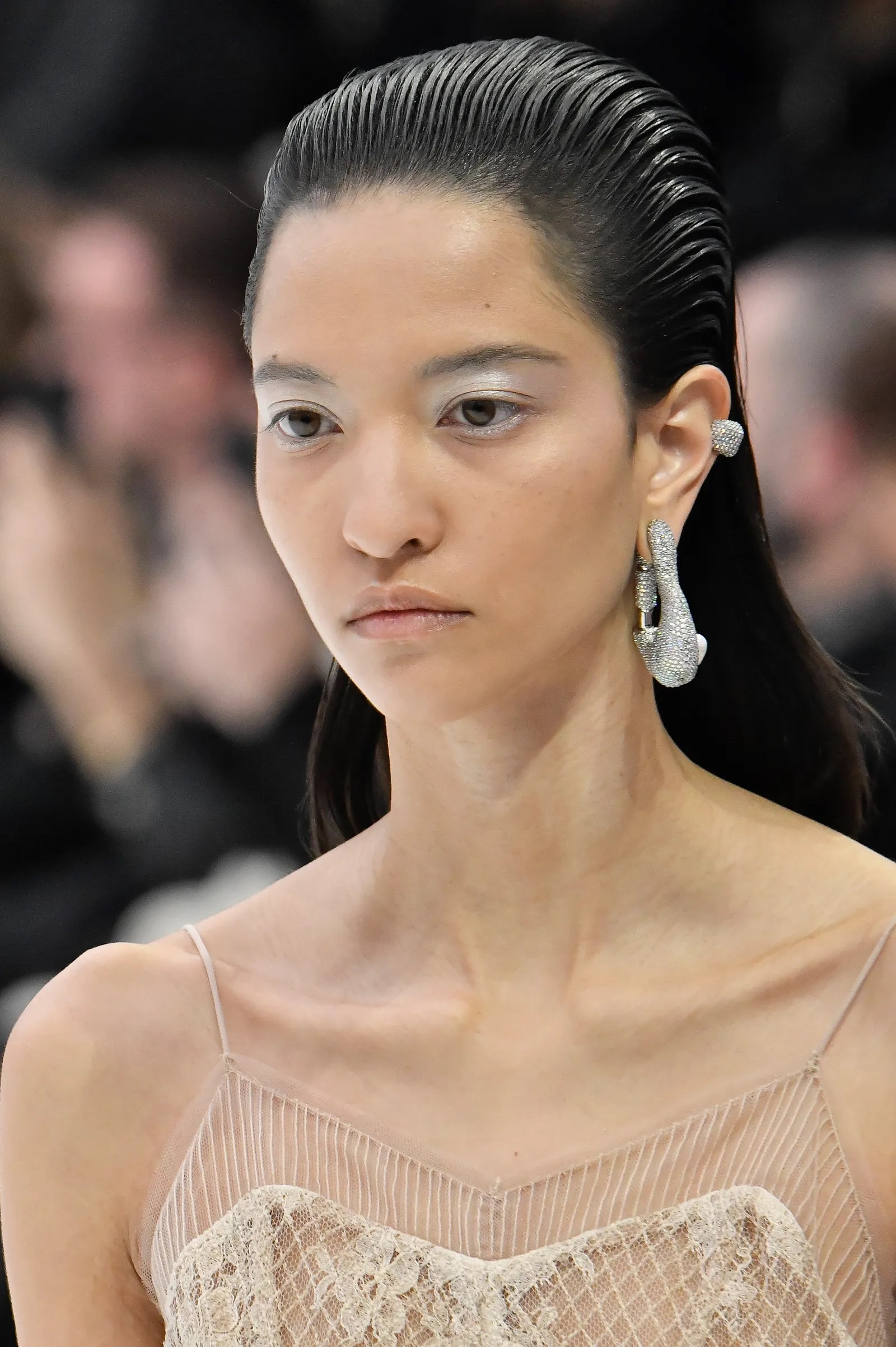 Pretty and fresh, as seen at Schiaparelli and Armani Prive. Get your hair a little wet, slick it back and pat some blush here and there for a minimal makeup look. Ideal for when you want to draw extra attention to your outfit. For better or for worse.