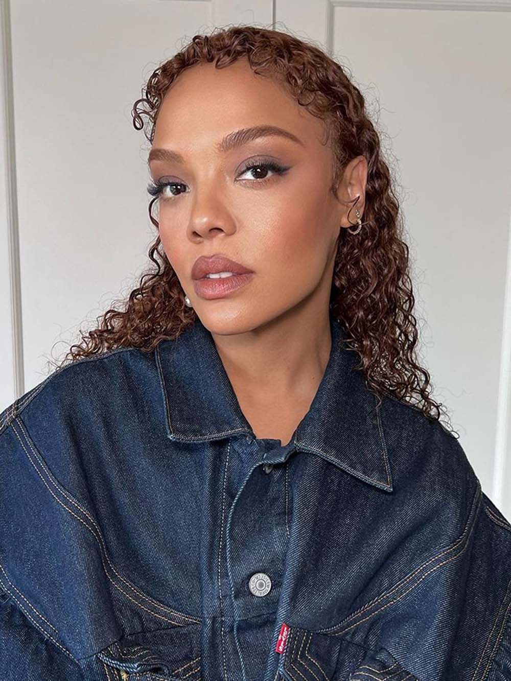 Sleek caramel curls on Tessa Thompson- Makeup by Keita Moore in 2022.