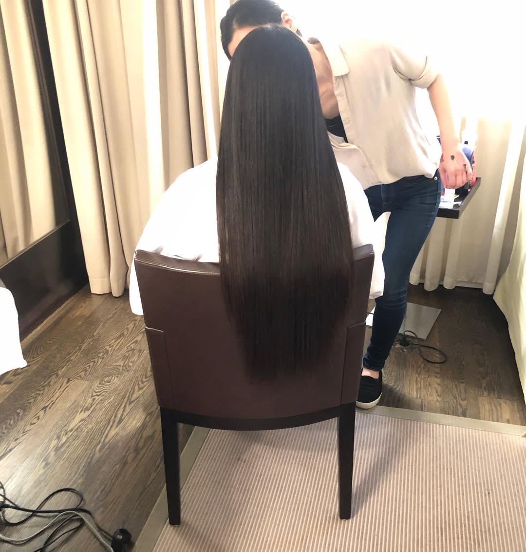 Today’s hip-grazing locks worn with a centre part have become her signature, achieved with lots of dedication and hard work – and “regular tiny trims”.