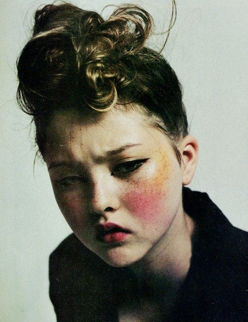 Messy bun, heavy on the eyeliner and the blush that would become one of her signature looks throughout her career. Featured in The Face, photographed by Mario Sorrenti, 1996.