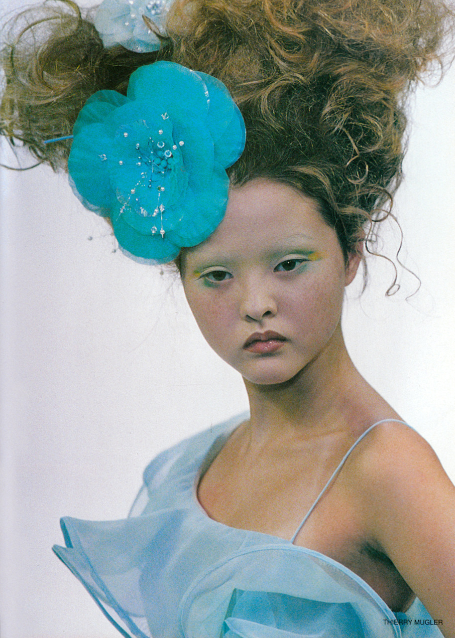 Sculptural curls, florals and a matte complexion for Thierry Mugler Spring Summer 1999.
