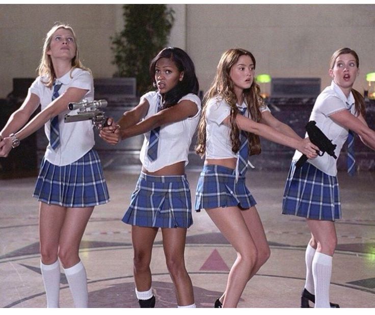 Long tousled waves, cropped shirt, necktie and a plaid mini. It must be Dominique in D.E.B.S. Someone get the girl a cigarette.