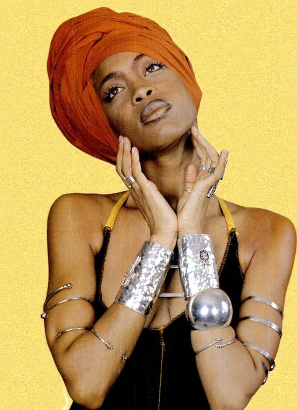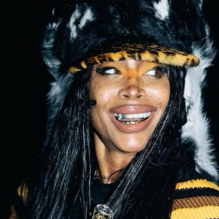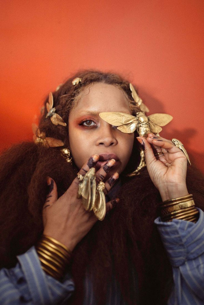 Cap fluffed, grin bejewelled, cheeks freckled, lashes spiked and hair sleeked: demonstrating yet again that Erykah is the queen of texture play.