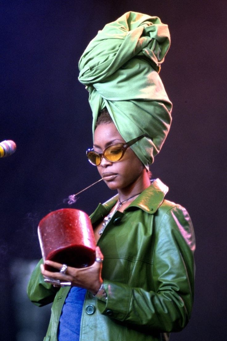 An unbothered Erykah lighting a candle mid-performance at the Lilith Fair festival - wearing a towering green turban, an iconic element of her onstage persona.