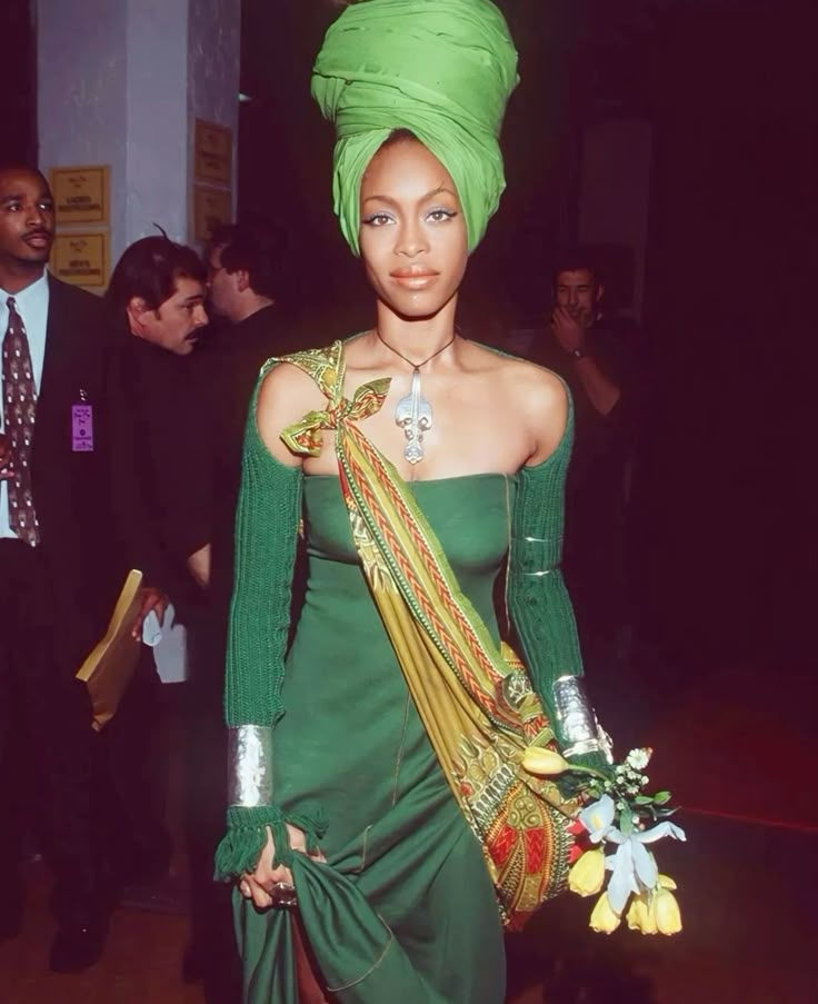 Erykah Badu captured in one of her most ritual-like moments. Draped in green from head-to-toe, adorning an architectural turban using a floral bouquet as nature's accessory.