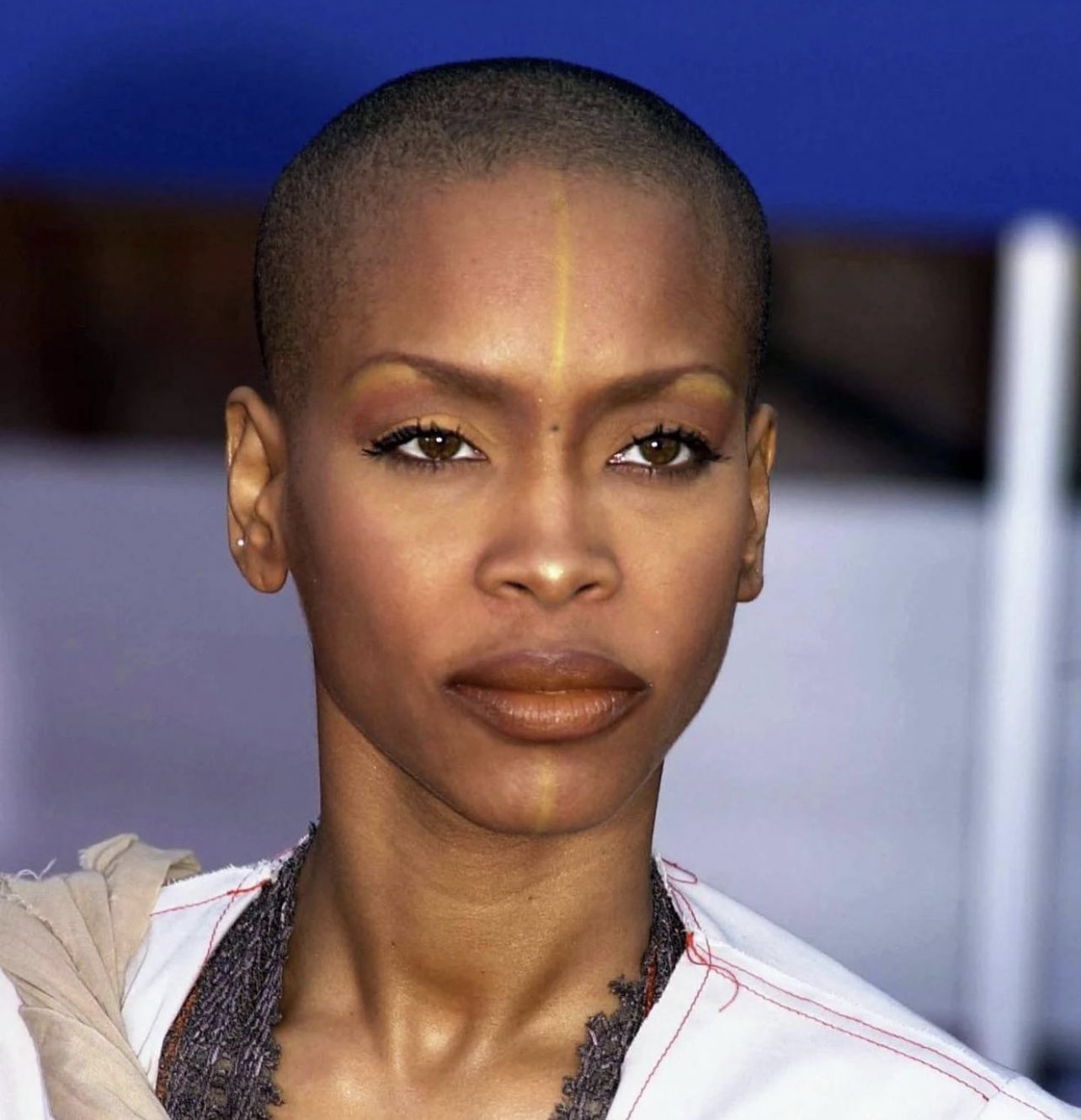 A shaved head, and striking makeup, at the Grammy Awards.