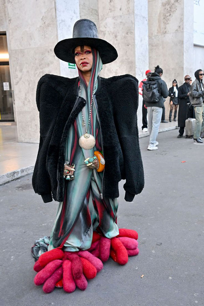Erykah Badu is never seen out of her fearless street style. Outside the Rick Owens show in Paris, she wears sea anemone slip-ons by Myah Hasbany, signature oversized top with rings and bangles from her personal collection.