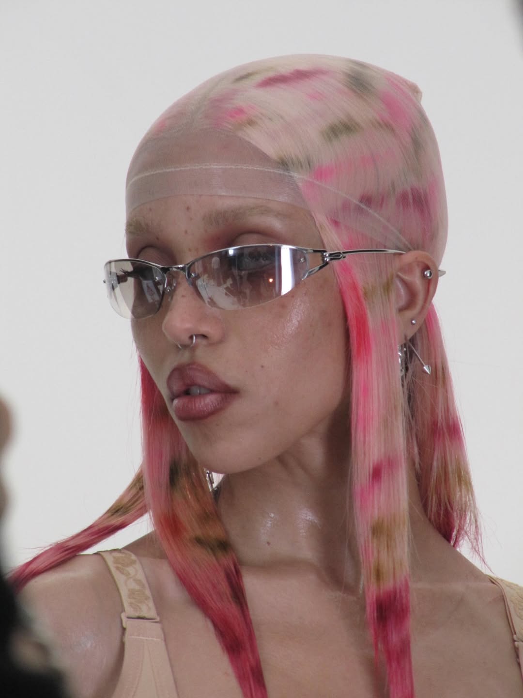 Splotches, dots, lines of demarcation. The more, the better. Accidental colour work is hot. FKA Twigs behind the scenes for Gentle Monster.