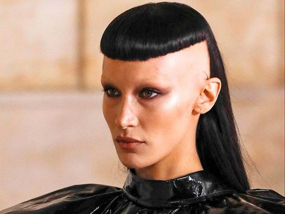 Bella Hadid at the Marc Jacobs Fall 2022 show at NYC. The look was designed by hair stylist Duffy and special effects artist Noël Jacoboni.