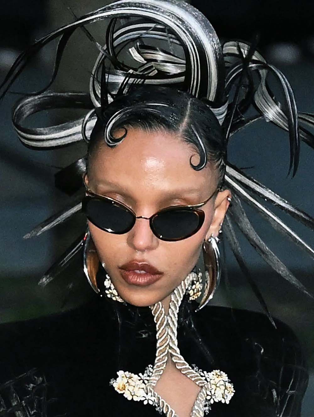 Otherworldly mother FKA Twigs sporting a spiral fantasy by hair stylist Louis Souvestre at the Schiaparelli show in 2025
