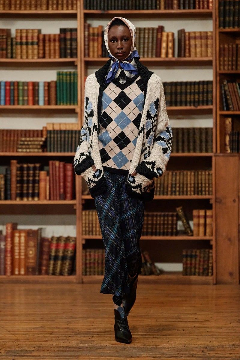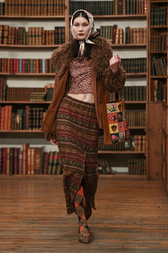 For Autumn / Winter 2024, Anna Sui took inspiration from Agatha Christie’s Miss Marple and Virginia Wolfe book covers, with a show that took place in an undeniably ‘Library-core’ setting. Layered knits and ankle-length skirts gave Geek Chic a vintage twist.