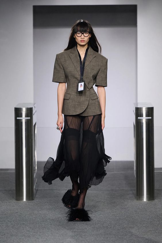 The resurgence of the Geek Chic trend in 2024 is once again attributed to Miuccia Prada who, for Miu Miu Autumn 2023, showed spectacle-clad models in knit twin-sets, pencil skirts, boxy wool jackets and sheer polka dot garments. The collection also sparked a new term used in conjunction with the modern iteration of Geek Chic, that being ‘Library-core’.