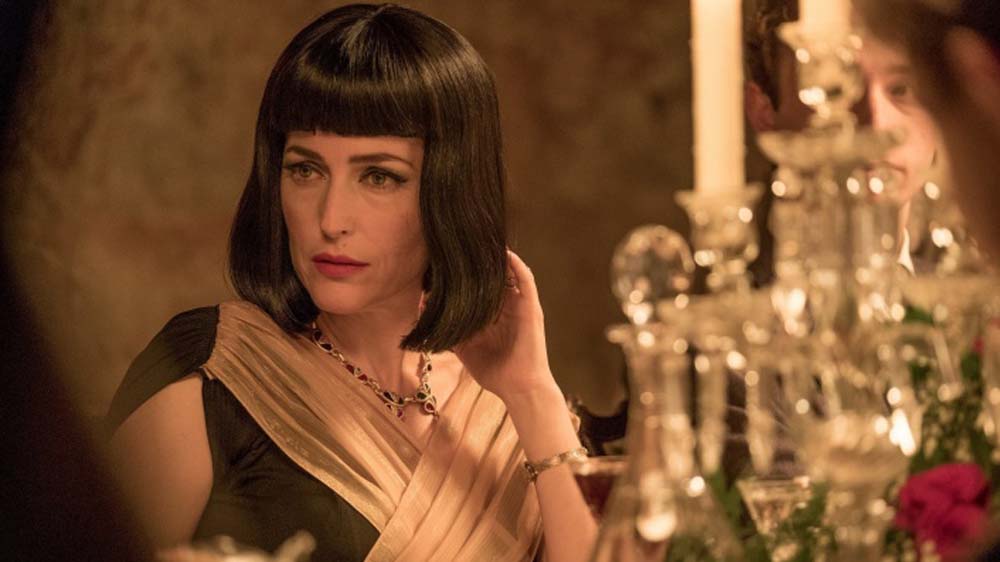 Blunt micro bangs and a blunt bob as flamboyant actress Magda West in Crooked House.