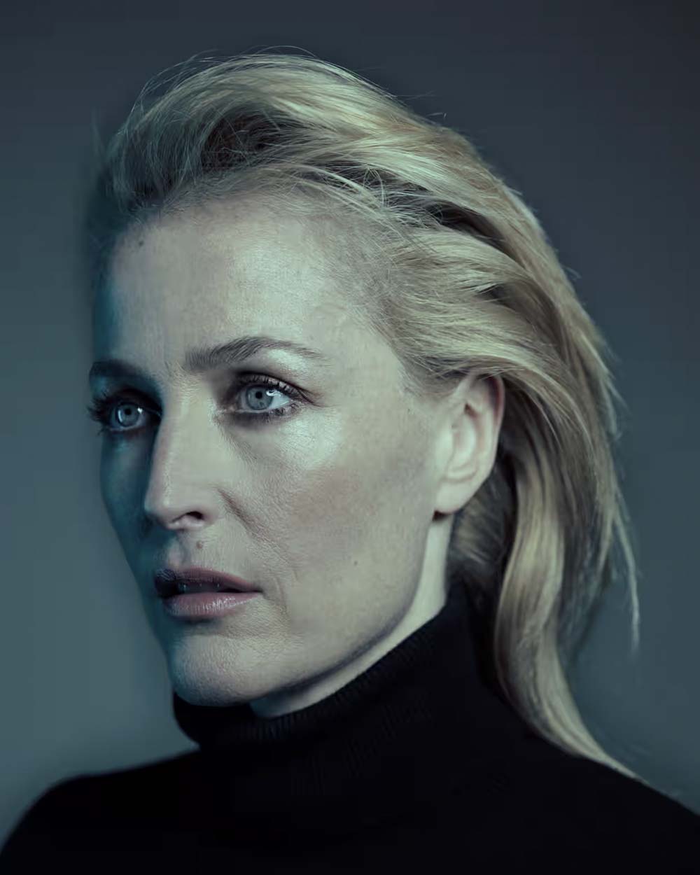 Gillian's signature swept-back hair, from The Guardian 2017 by Nadav Kander.