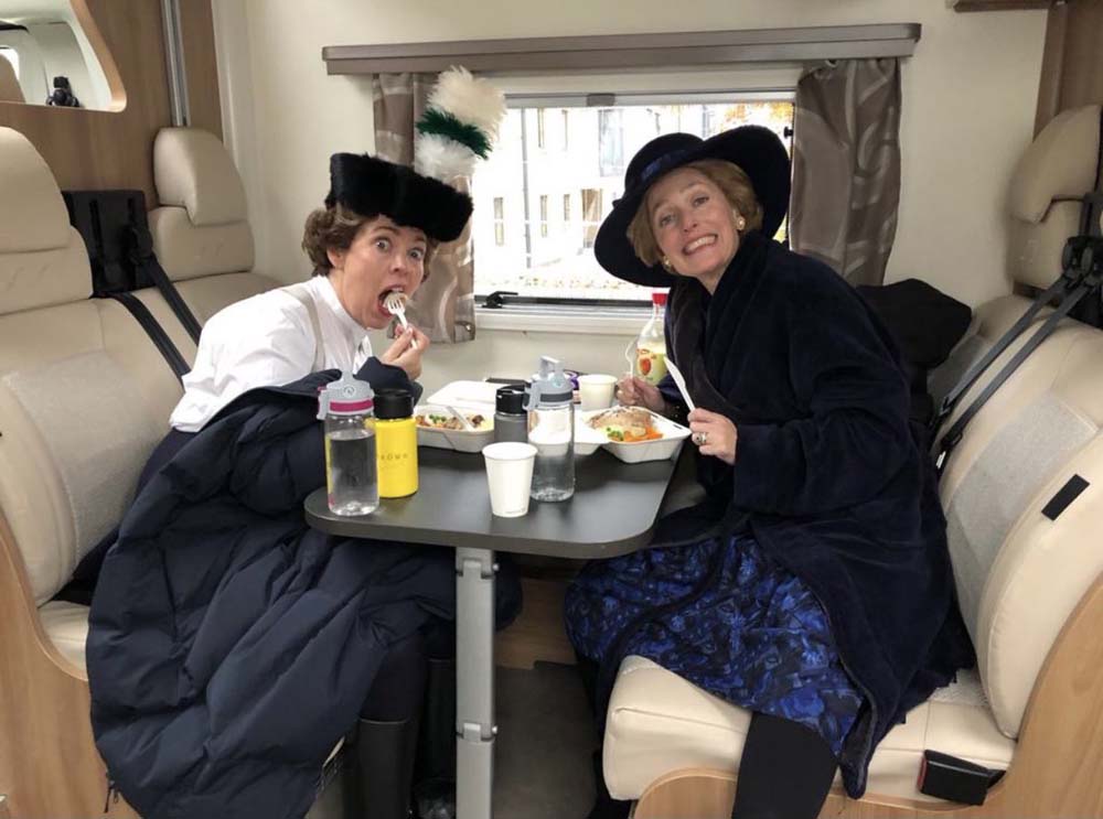 Lady in waiting. Gillian Anderson and Olivia Colman BTS during filming of The Crown,