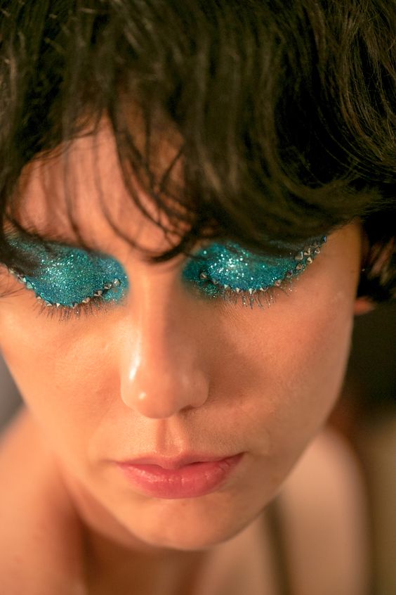A glittered teal eye look ornamented with individually placed crystals on the lash line for Marc Jacobs’ Spring 2020 collection.