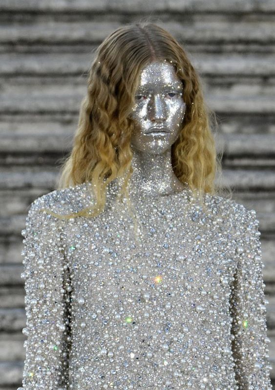 Head-to-toe silver glitter saturating the skin creates an alienesque beauty feel for Valentino Couture. We’re definitely adding this to the “to try” list.