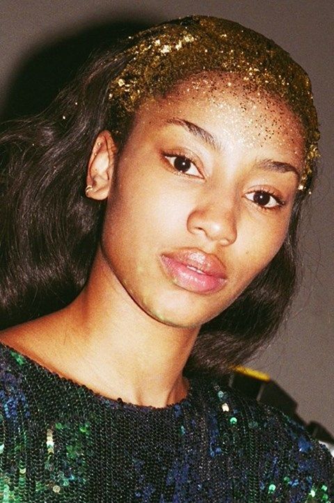 Glitter doesn’t always have to go “disco”. At Dries Van Noten, natural skin and a dewy lip were complemented by a subtly grunge glitter eye. A more low-key glitter look that we adore.
