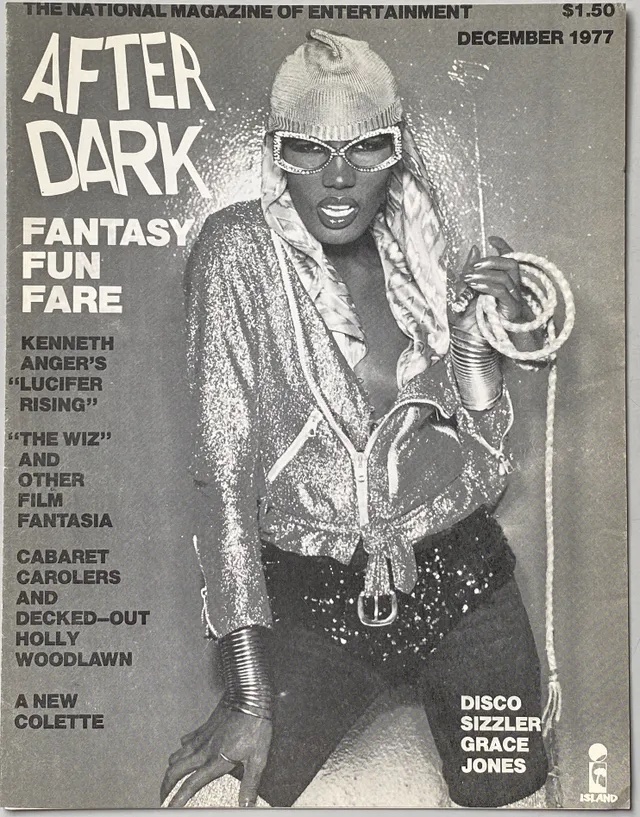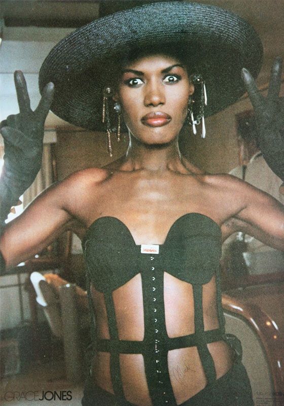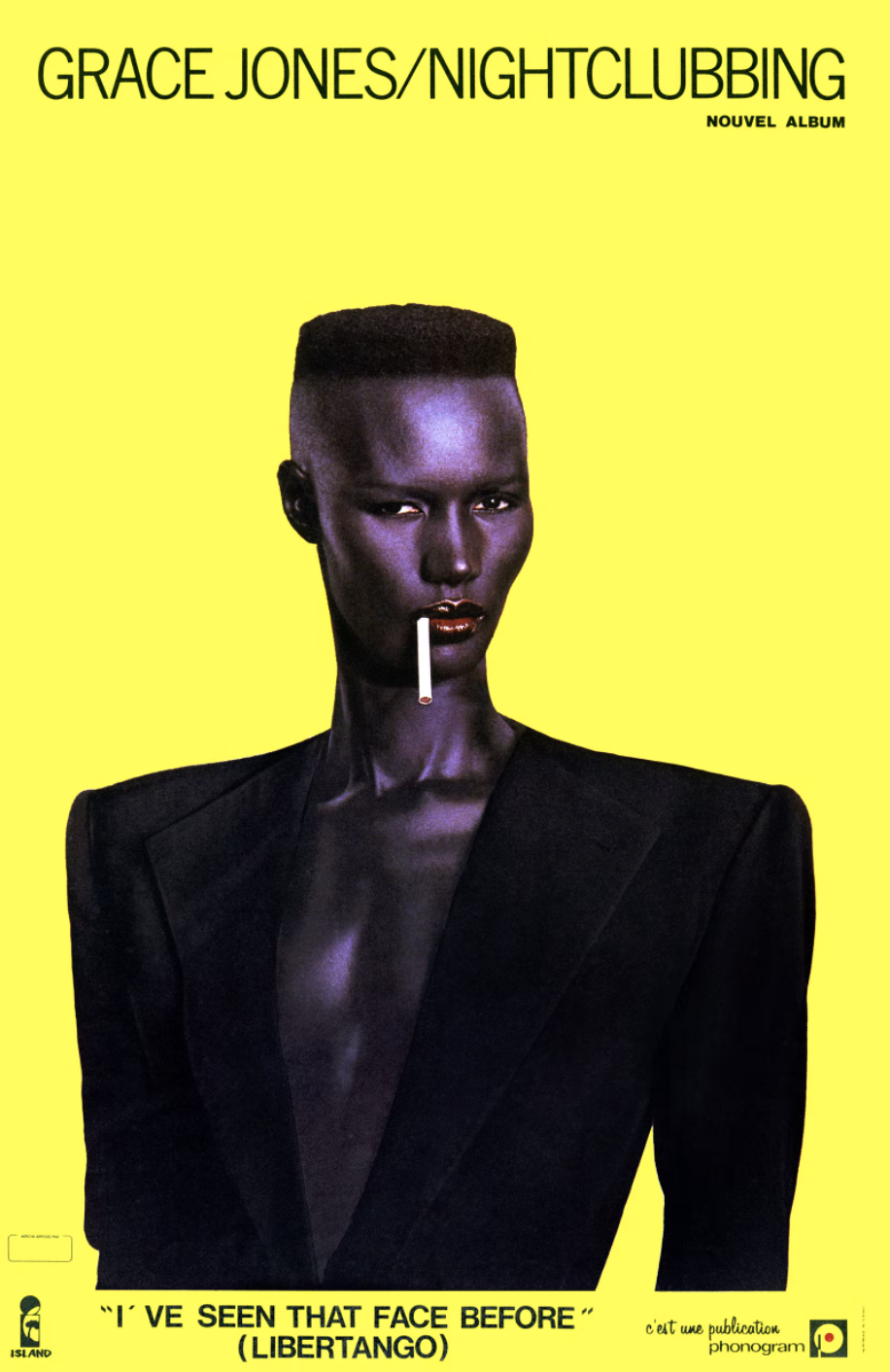 The iconic publicity poster for a stop on Grace Jones’s Nightclubbing record tour in France in 1981. All angles here with her memorable flat-top hairstyle & wide-shoulder suit jacket.