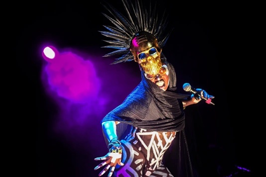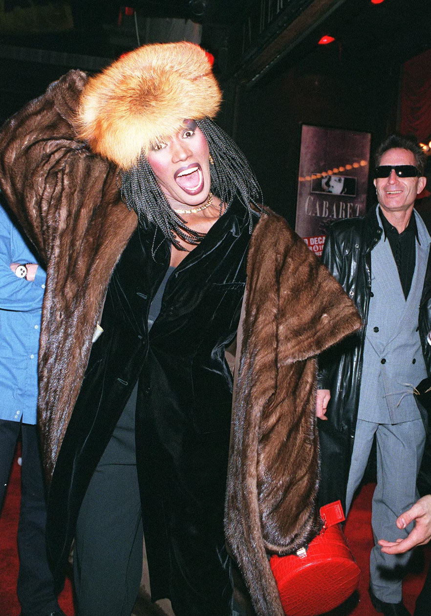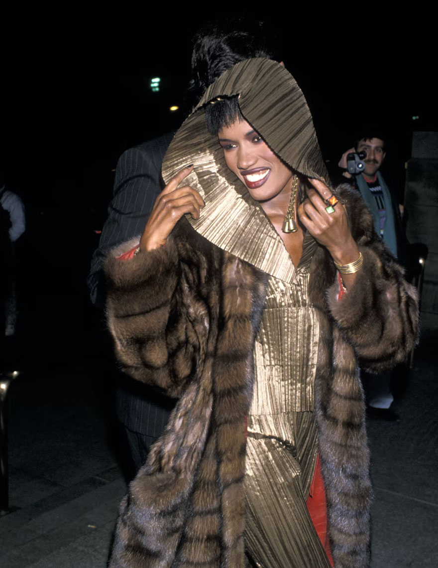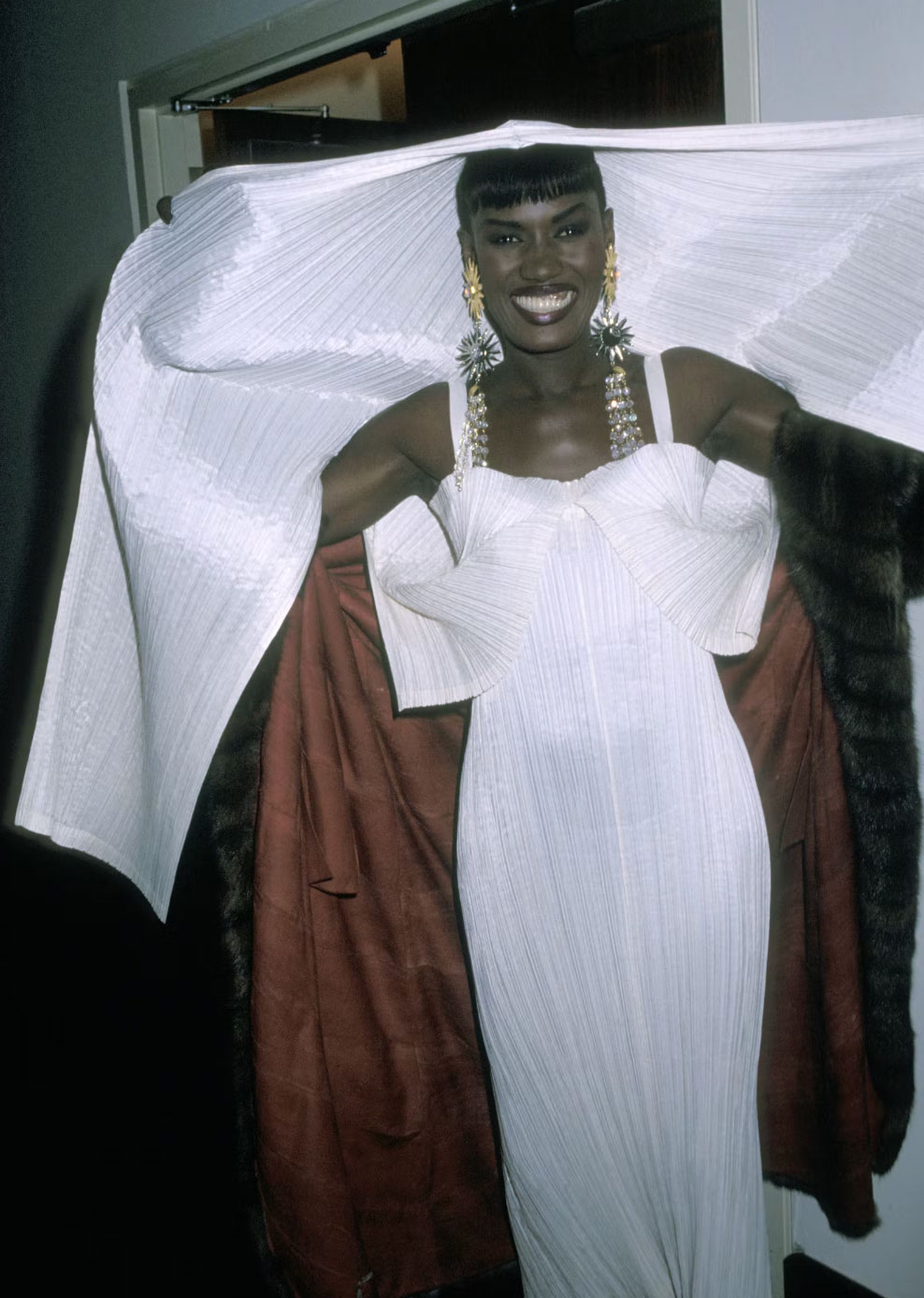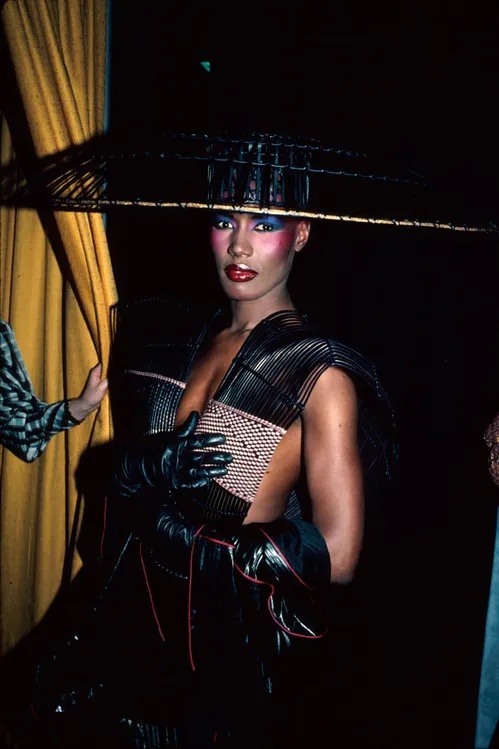 Grace wore an Avant-garde Issey Miyake woven rattan vest and sculpturally-pleated skirt to the Grammy Awards where she presented with Rick James.