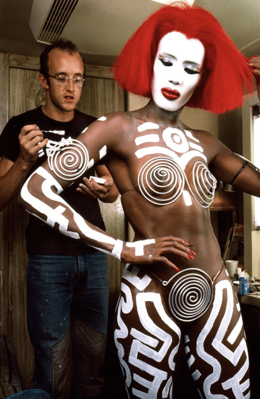 Grace Jones on the set of Vamp with Keith Harring and a blunt red bob.