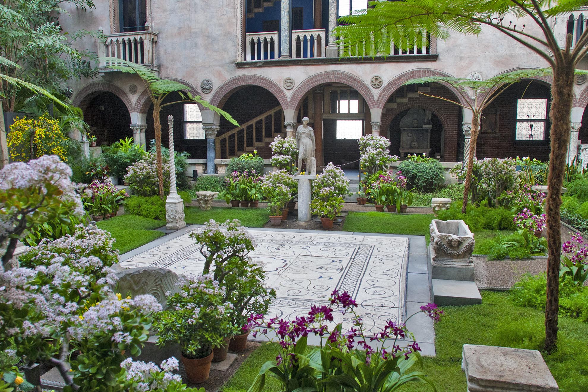 Within the palace walls sits a Venetian-style palazzo, surrounding an elegant courtyard decorated in verdant plants, masterpieces hang next to architectural elements Gardner purchased from Europe.