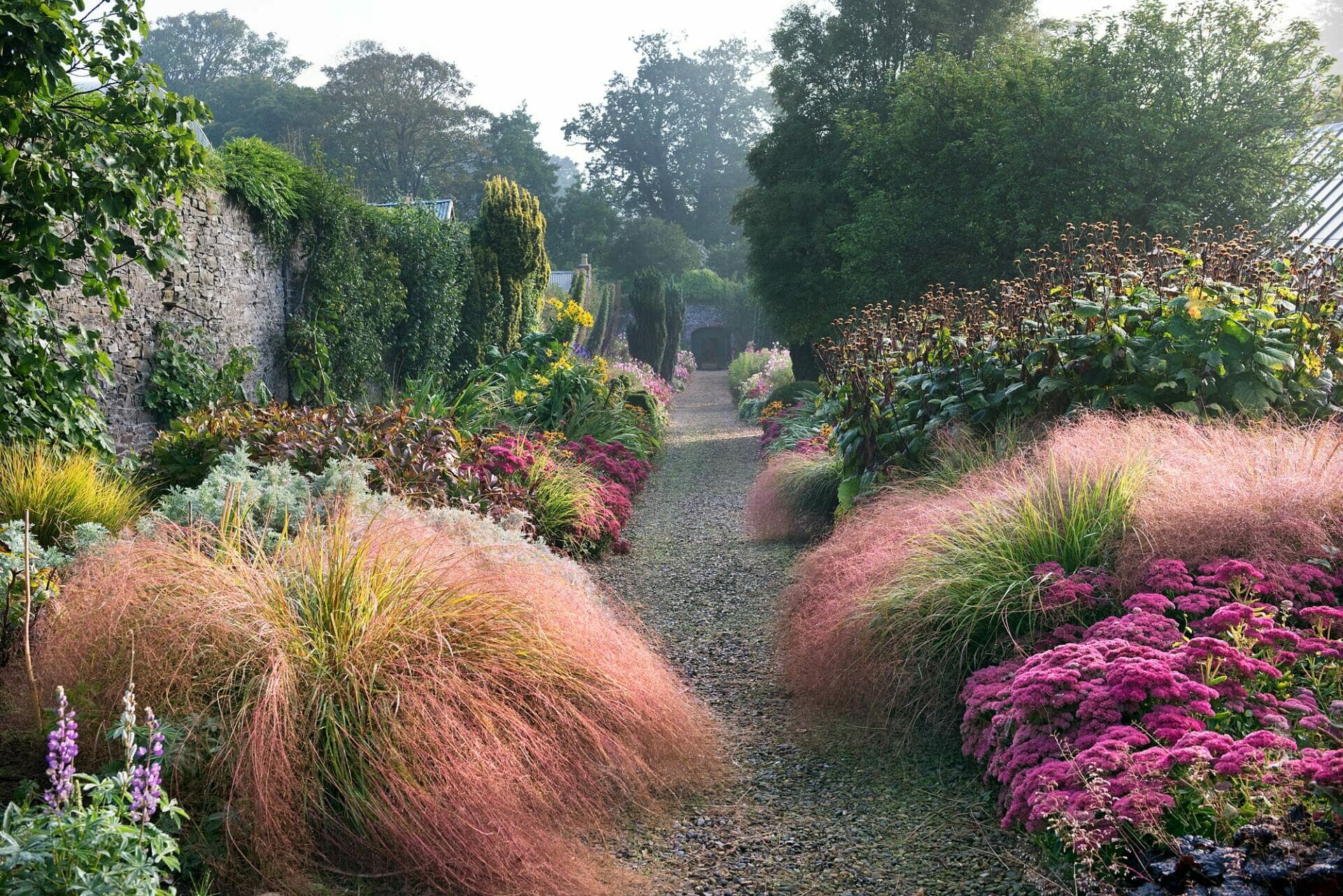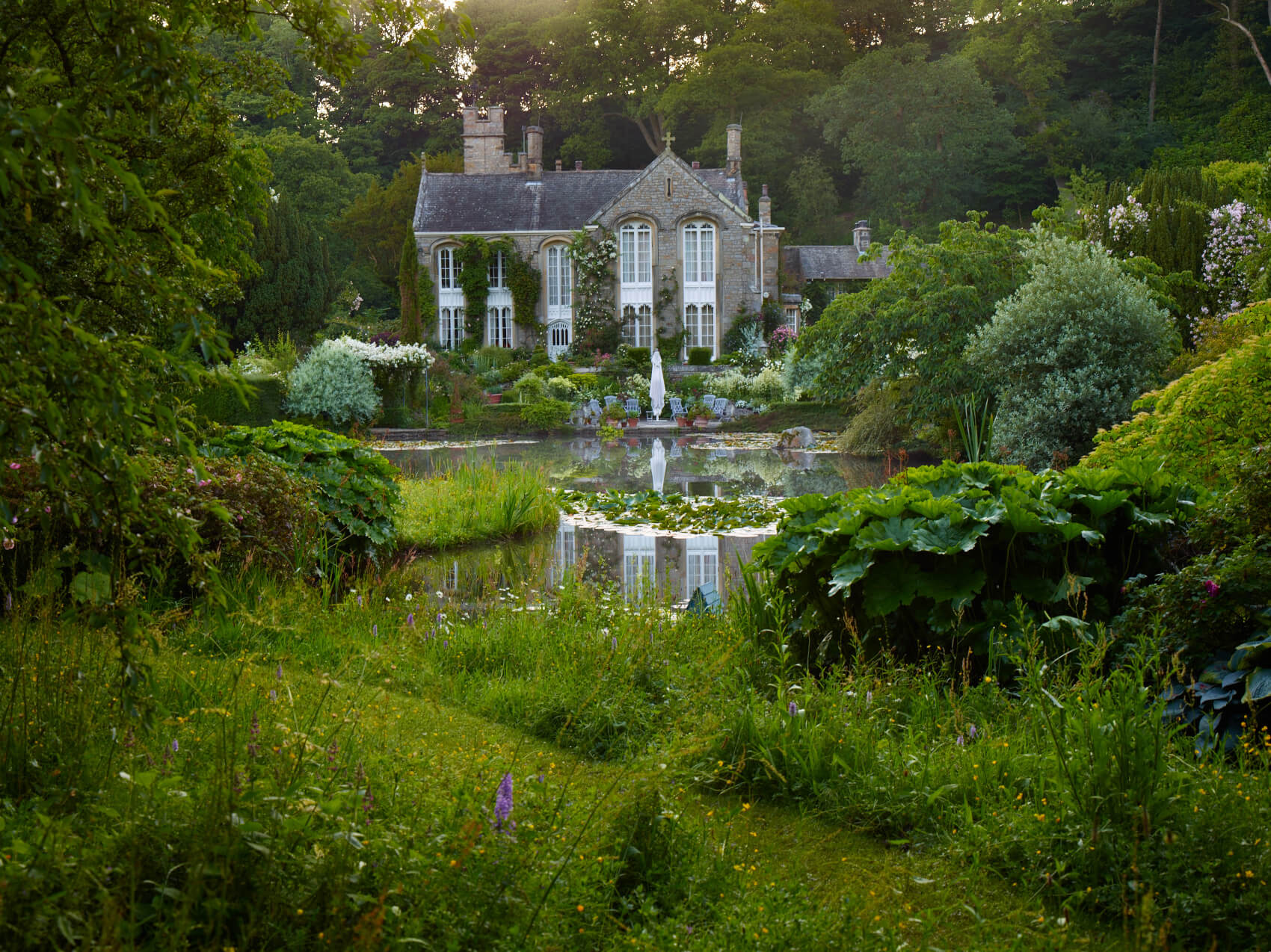 The sound of water is ever-present. The terraces descend from the house to the lake, and are planted with roses, clementis and more tender plants in season, and the predominating pinks, purples and silver-whites compliment the rugged grey stone of the Gothic house.