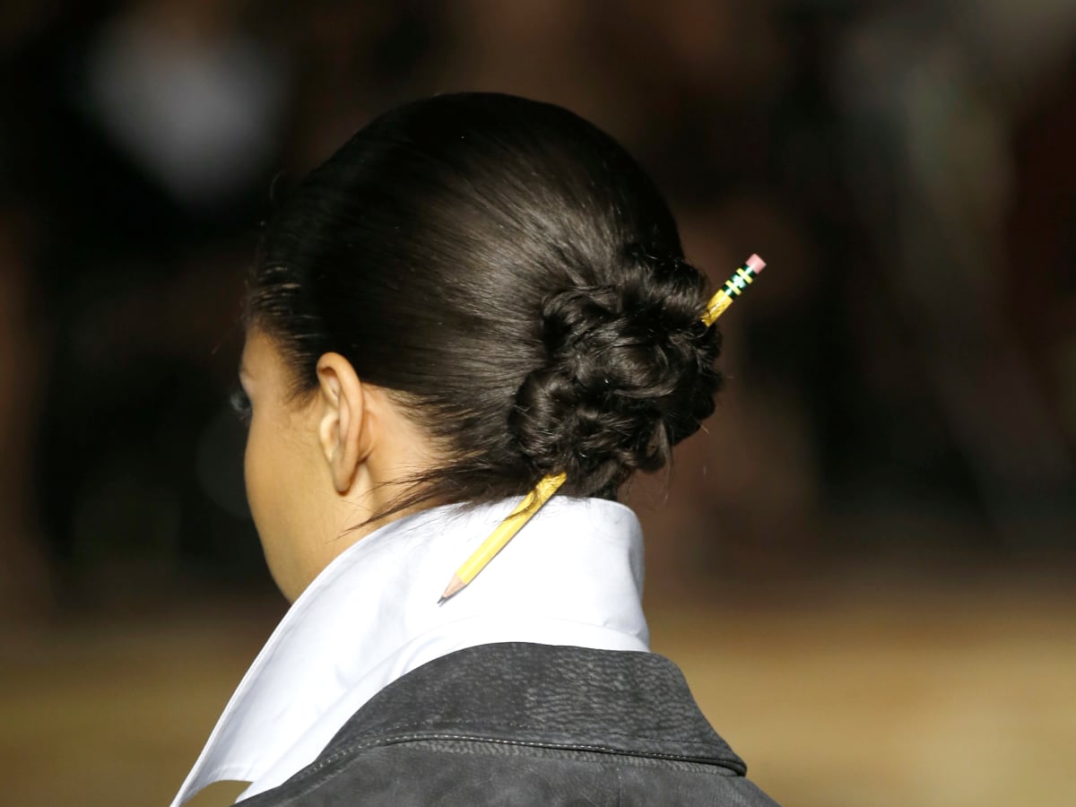Super sicked into a ballet bun with a flouncy scrunchie to complete the look.
