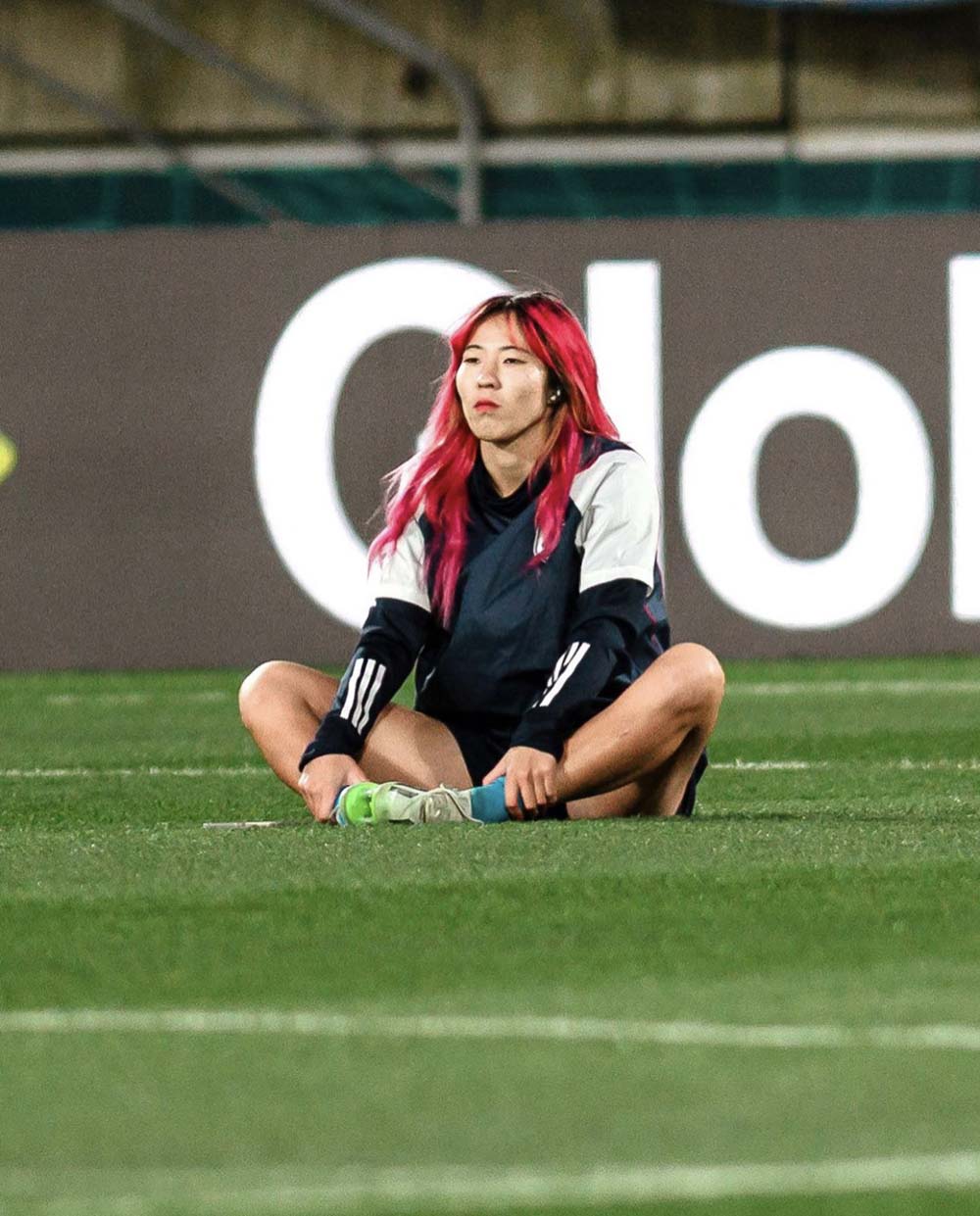 Leave it to a member of the Japanese team to serve a bold colour-popping hair look like this one. Pulled back into a bun with a black headband, Jun’s signature pink hair makes a statement wherever she is, both on the field and off.