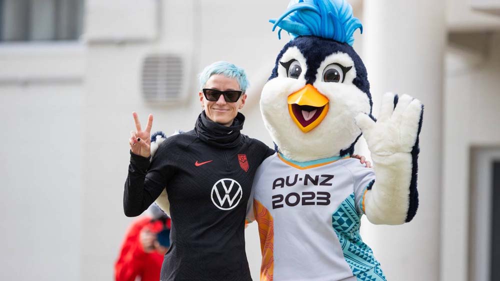 Megan peace signing for a pic alongside the FIFA Women’s World Cup 2023 mascot ‘Tazuni’ the “fun, football-loving penguin”.