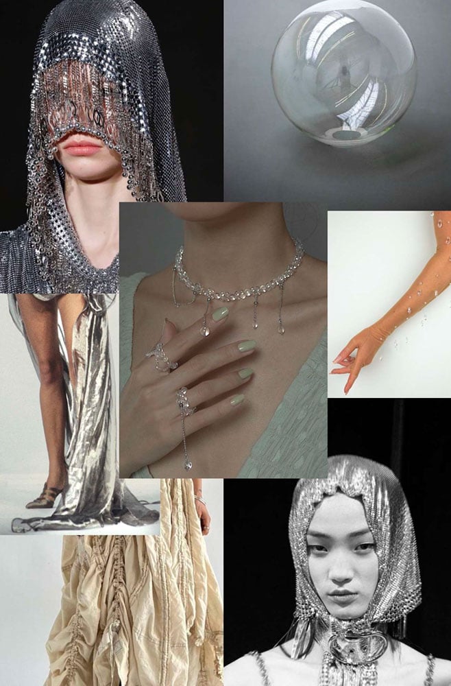 Mysticism layered with sheer, ruched skirts. Metallic mesh hoods paired with jewels that drip. A glassy mirrored orb carried as your accessory.