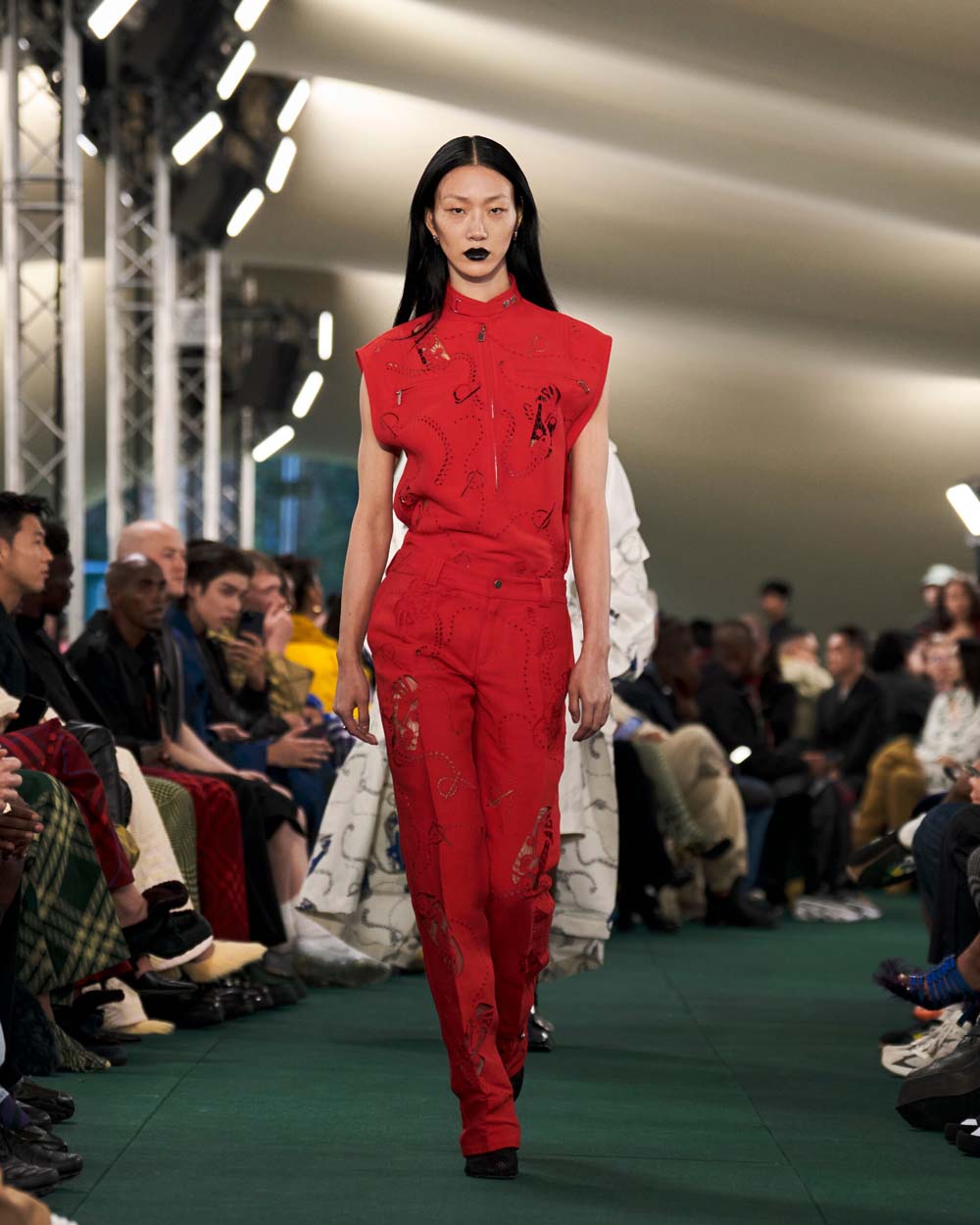 For beauty, Isamaya Ffrench created a red under-eye look with little fake tears that made the models look weepy. “They are, as many of us are, upset about the state of the world”, both in this post-apocalyptic world that Williams has created and in the world we’re living in now. Thought-provoking and trag-chic.