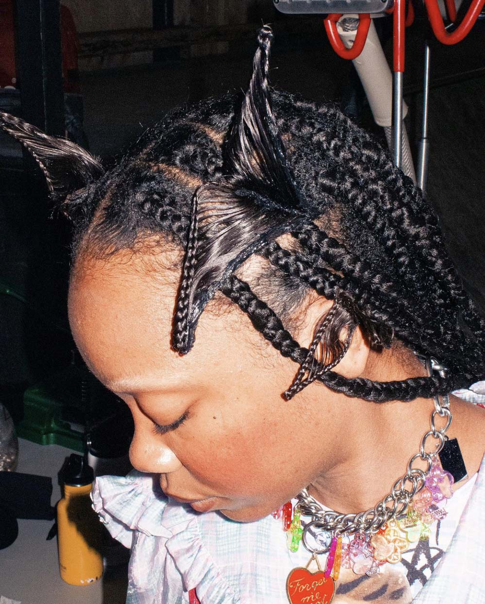 Some of the buns were braided using mediaeval techniques but shaped in a futuristic way, further cementing the contrasting narrative present throughout the collection.