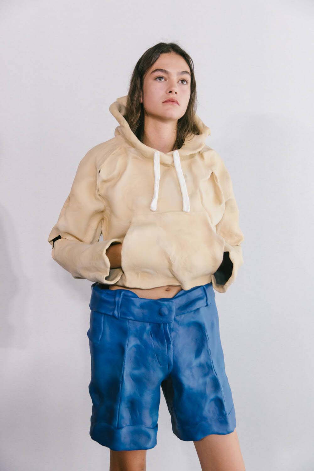 For beauty, the “clean girl” aesthetic was presented with Molly Goddard teaming up with NZ-based skincare brand Emma Lewisham, resulting in a make-up look that was natural and barely there (other than the odd graphic black eyeliner look). A gentle facial massage was also given to the models to stimulate blood flow and give the complexion a fresh-faced glow.