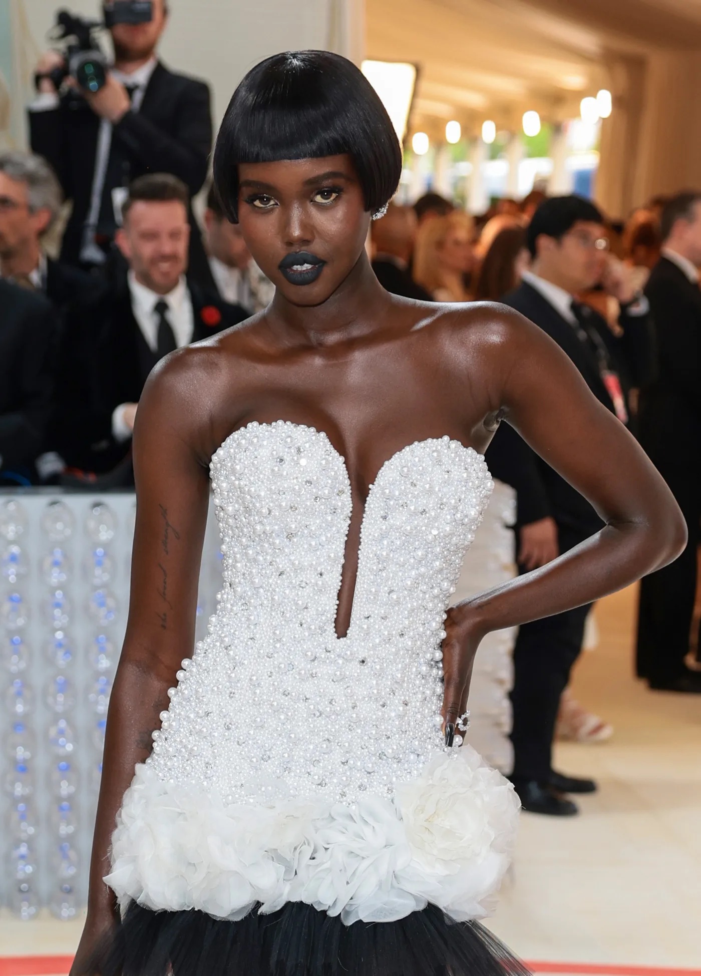 Adut Akech's chic black bob and blunt baby bangs are giving 1920s glam while the black lip and monochromatic gown are in keeping with the theme.