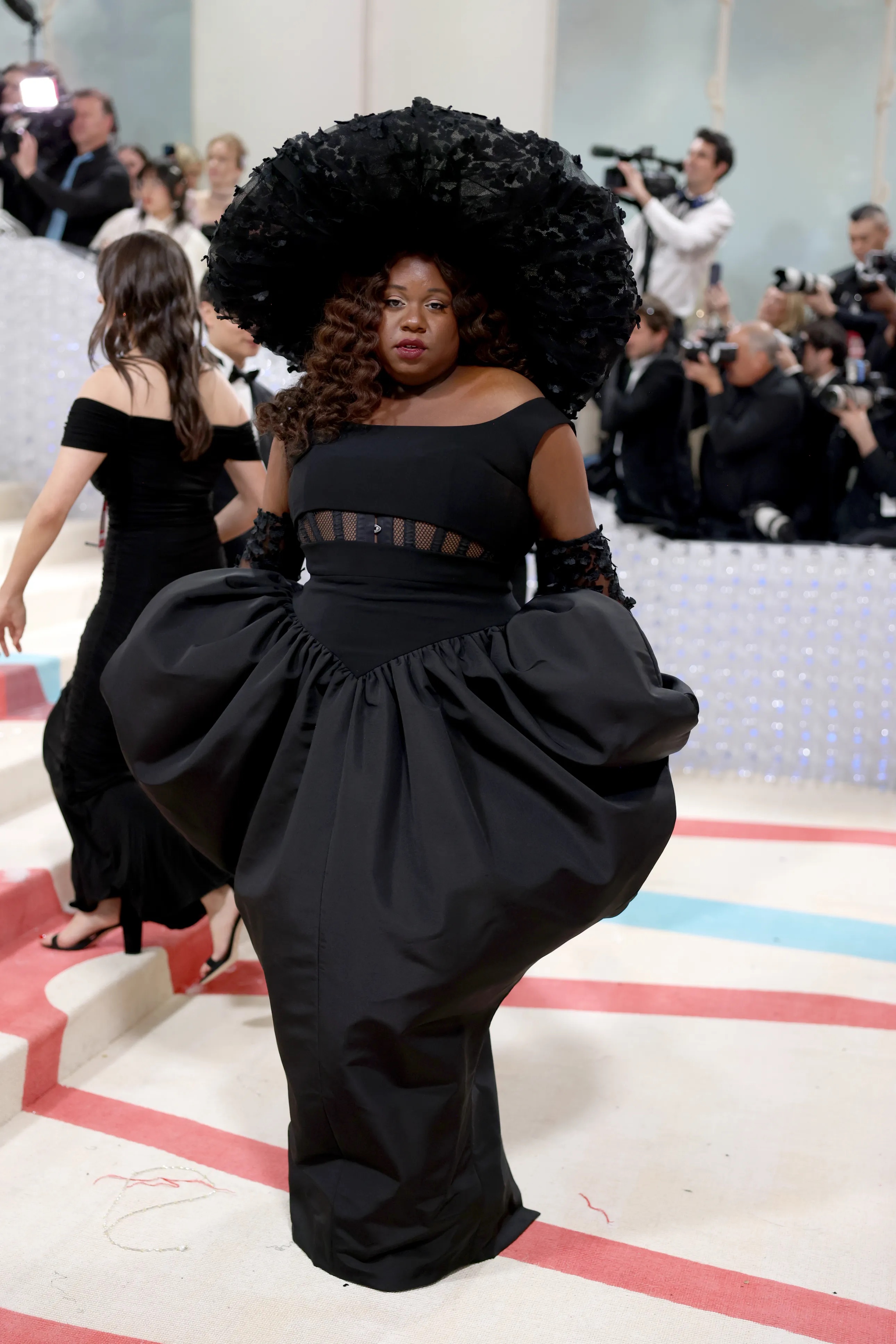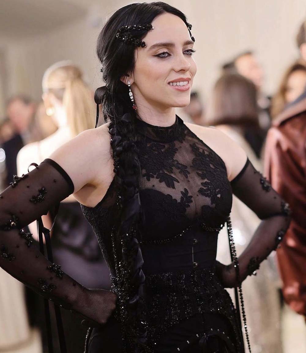 Not far off the vibe from her last Met Gala look with this gothic glam. Billie Eilish in a custom Simone Rocha dress with embellished opera gloves, black diamond barrettes and a bow-bound braid. It's the styling for me.