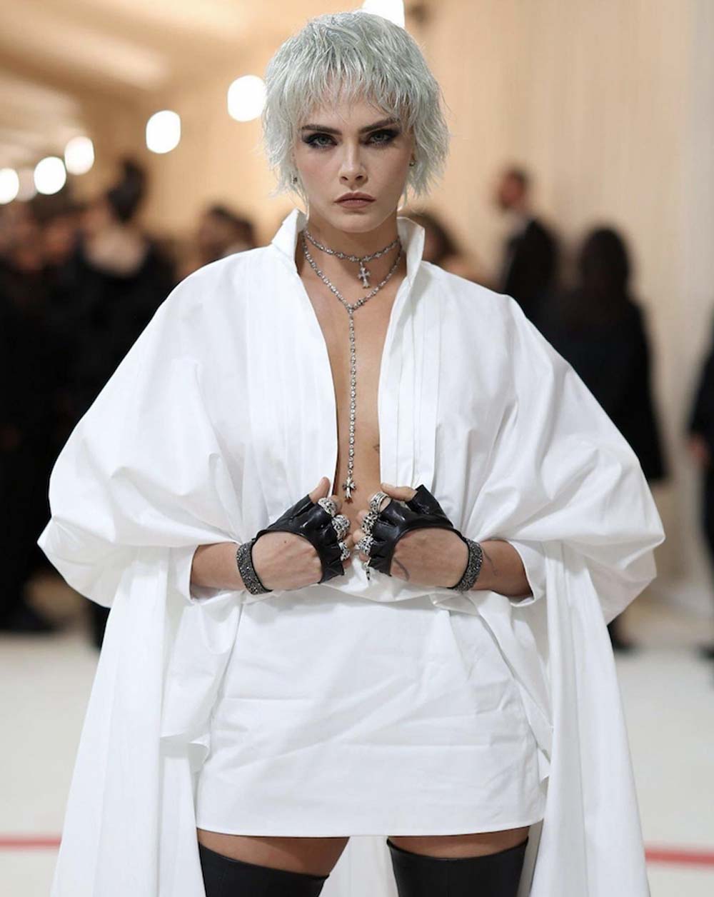 A nod to Karl with silver textured hair, crisp white shirt and leather gloves, Chanel girlie, Cara Delevingne.