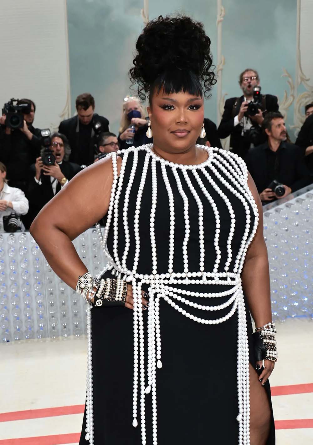 Elegant Lizzo; from the messy bun and bangs to the pearly bodice and leather gloves. It's a yes from us.