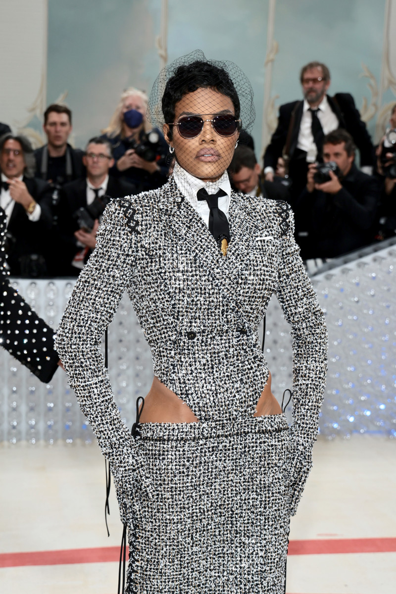 Teyana Taylor takes fashion seriously, she's killing this Thom Brown tailored tweed, what you can't see is her tiny Karl Lagerfeld-esque ponytail at the back.