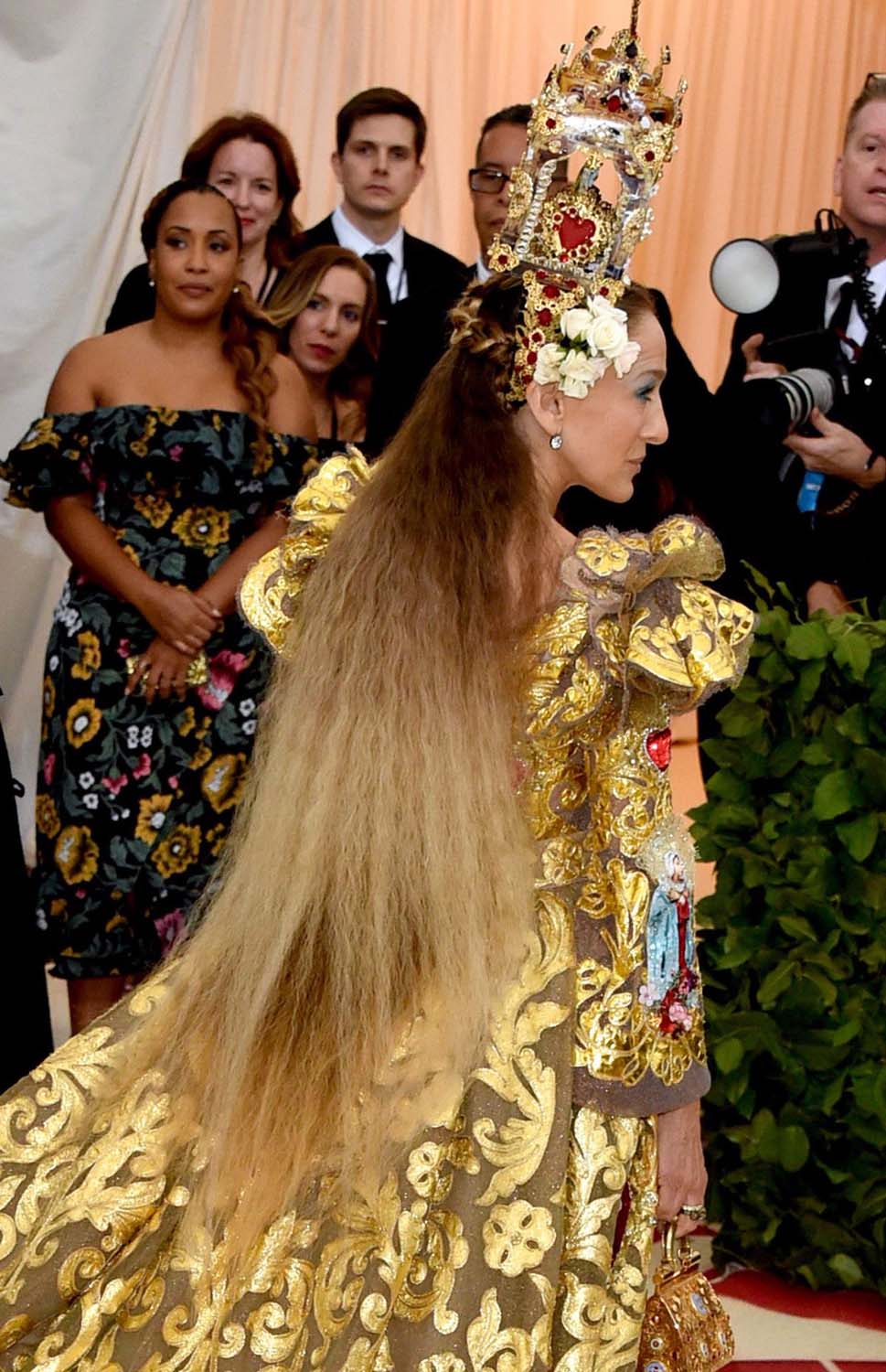 SJP outdid herself by wearing yet another elaborate headpiece by Dolce and Gabbana depicting a nativity scene on top of her Rapunzel-like locks.