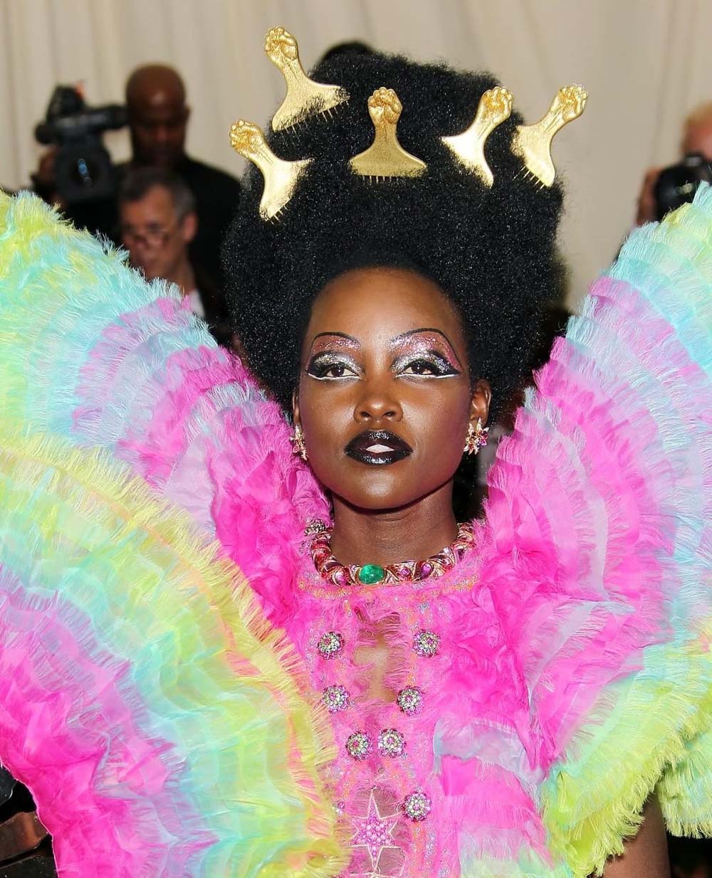 Lupita Nyong'o never misses. Her hairstyle complete with gilded hair picks was a nod to black hair texture and artist Lauren Kelley's 2007 self-portrait 'Pickin.'