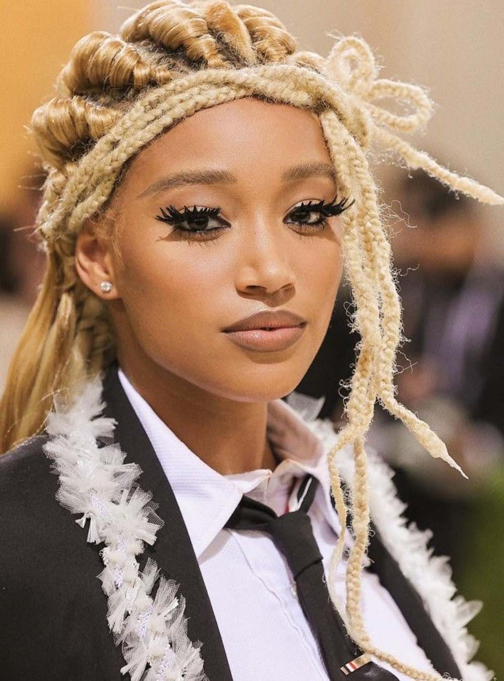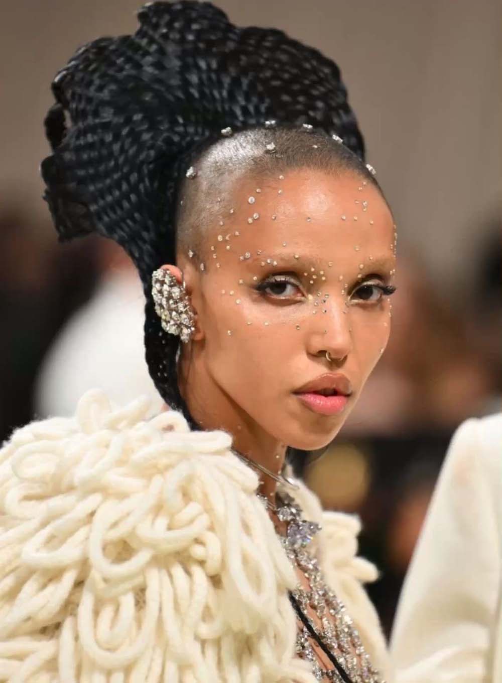 FKA Twigs, ever the visionary in an ancient-futuristic crown hairstyle by Ruka hair, complete with crystal face gems on her half shaved head.