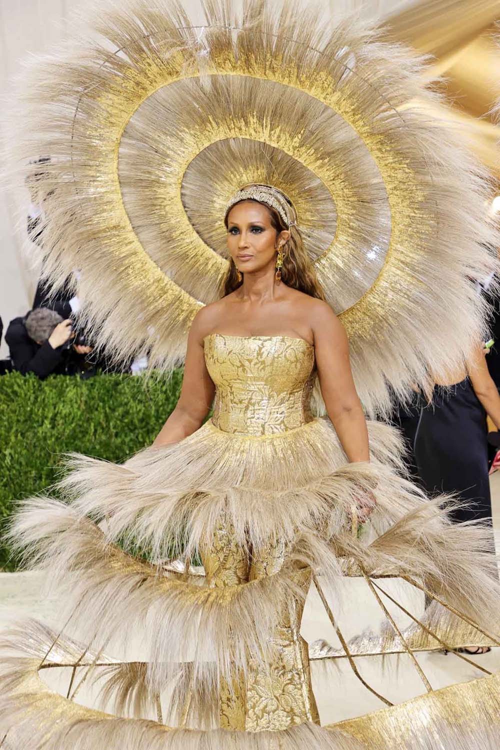 Iman shutting down the carpet in a custom Harris Reed headpiece and gown designed in collaboration with Dolce and Gabbana. Perfectly fitting for a queen.