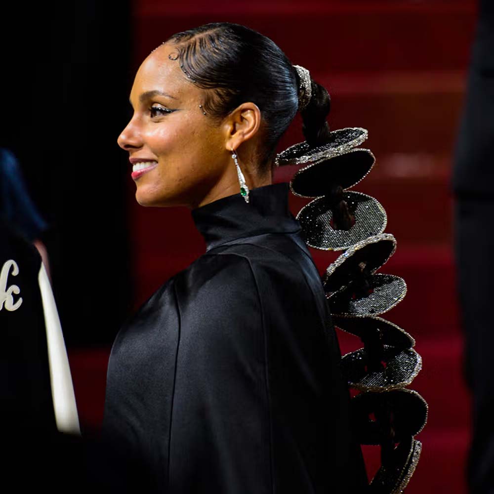 Alicia Key's ponytail was embellished with disc-like accessories resembling CDs.
